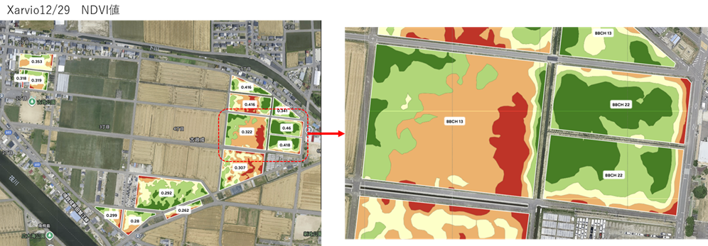 こちらは12/29のNDVI値です。おおよその生育ムラや土壌診断結果、地力ムラを把握してから実際の圃場を観察しておいて施肥データを作成する際のサジ加減の参考にします。
