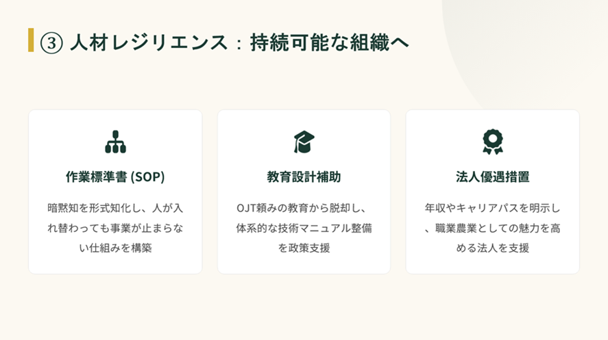 家族経営と企業経営は全く異なるものですので、経営者のマインドをどのように変えていくのかが担い手育成・安定経営において、とても重要なカギだと思います。