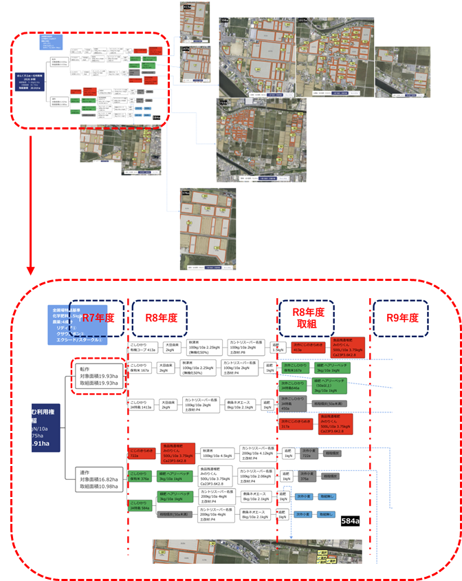 例えば赤枠内の圃場は、土壌診断値が腐植2%、PHも5.6と低く、リン・加里も不足しています。