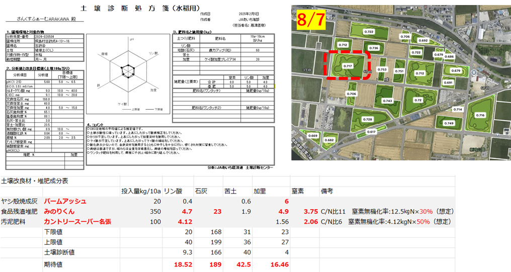 資材それぞれの特性(赤字の数値が多く含まれている)をいかして施用し化学性のバランスを整えていきます。