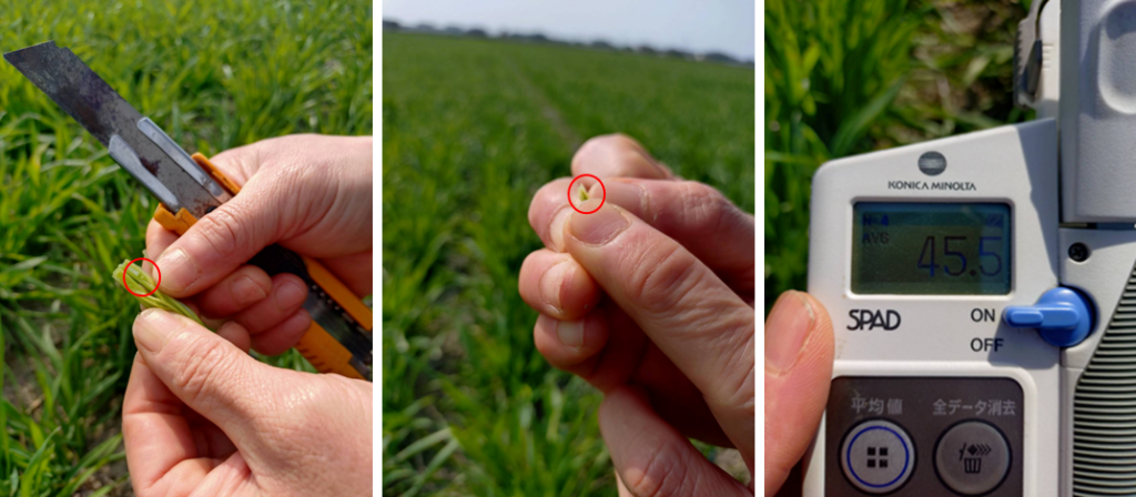 茎立期追肥はマイルドキープ(NPK/17:2:3)を使用し窒素分で生育ムラに応じて3~6kgN/反の範囲で加減して施肥設計します。