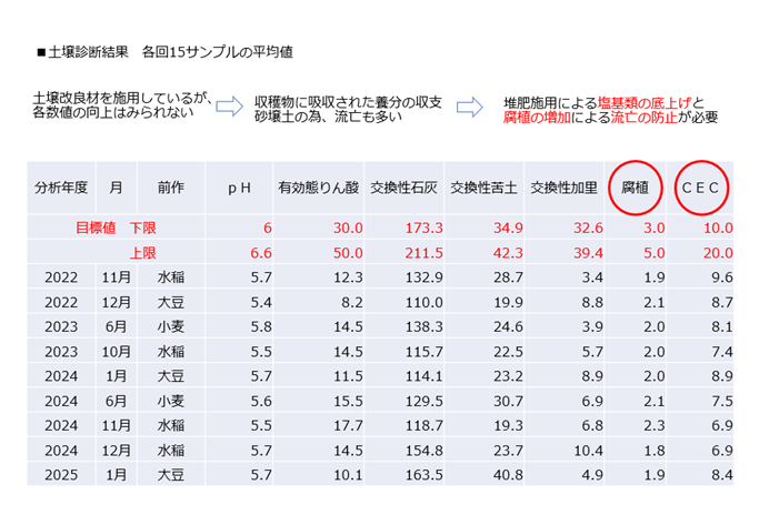 2022年から本格的に取り組みを始め、少しずつですが各圃場の状況や投入している土壌改良材の効果、作付け品目や管理方法による塩基類の増減が見えてきました。