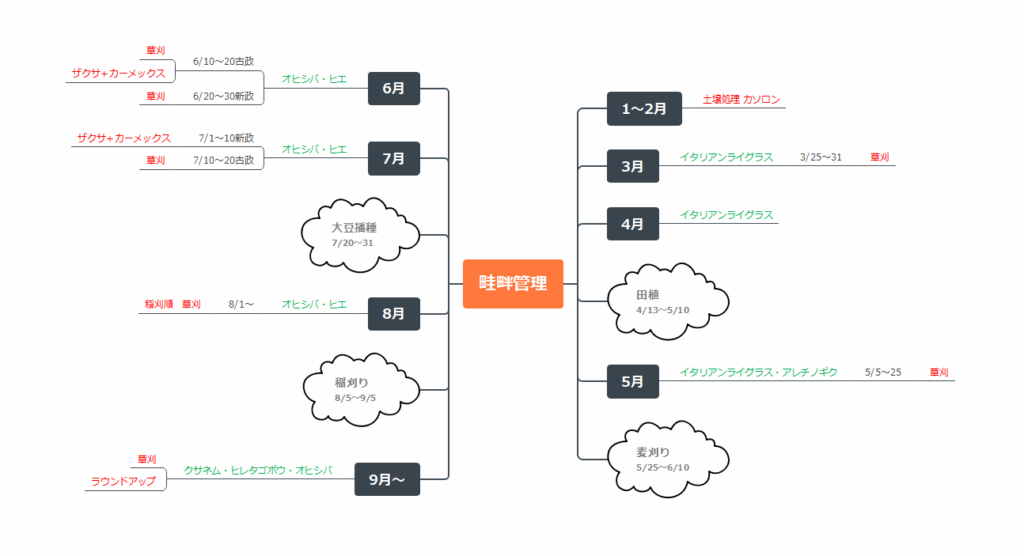 畦畔雑草については、昨年除草剤中心の管理から草刈りを主体とした体系に変更しました。理由は以下の4点です。