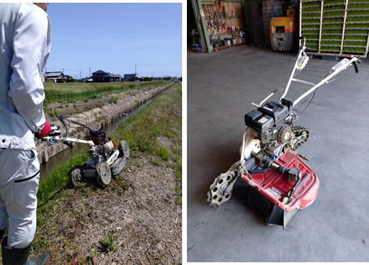 ウイングモアは畔が軟弱な場合が多いのでクローラ仕様です。刈幅は710で広いですが、やや取り回しに体力が必要です。主に中畔用に使います。