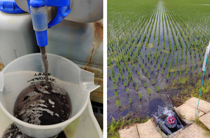 水出し口周辺のタニシの活動抑制と稲自体の活力剤として流し込み施用しています。