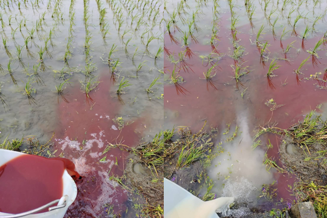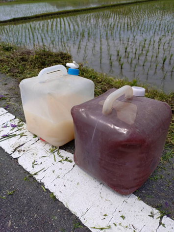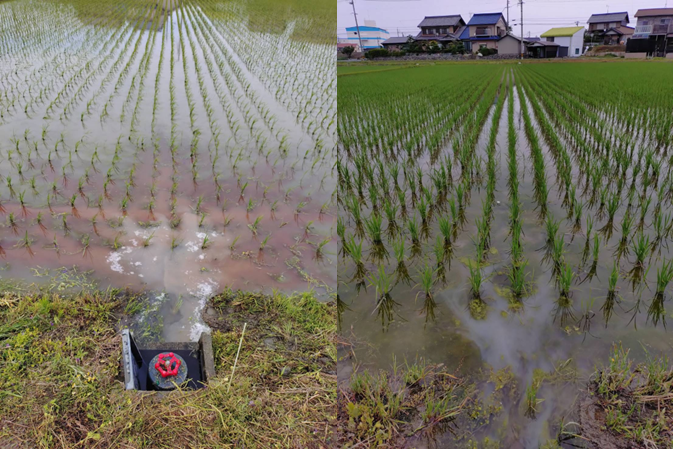 基本的には浅水管理とモゲトンのドローン散布で対応していますが、減農薬の圃場には農薬カウントの関係上散布できないので、えひめAIと光合成細菌の流し込みで効果があるかどうか試しています。