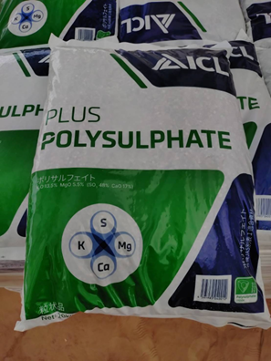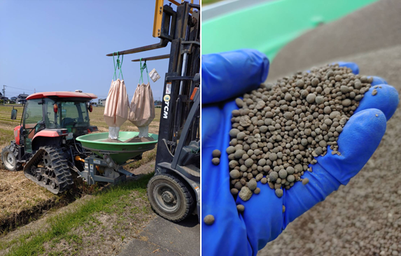 50日ほどかけて硫黄が溶出する有機JAS適合資材です。硫黄はタンパク質の3次構造をつくる大切な要素なので油脂植物の大豆と相性がいいのではと期待しています。