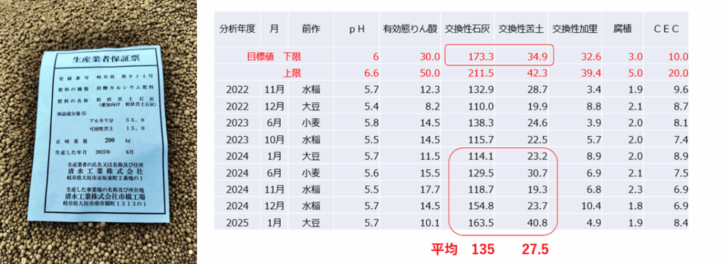 過去5回の平均は石灰135、苦土が27.5でそれぞれ不足分は石灰38、苦土7です。