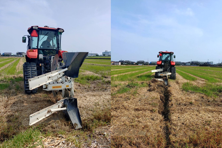 大豆の播種前作業として、圃場の明渠の草刈りと掘り直し、除草剤散布を行いました。